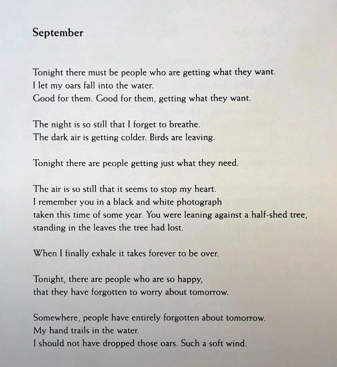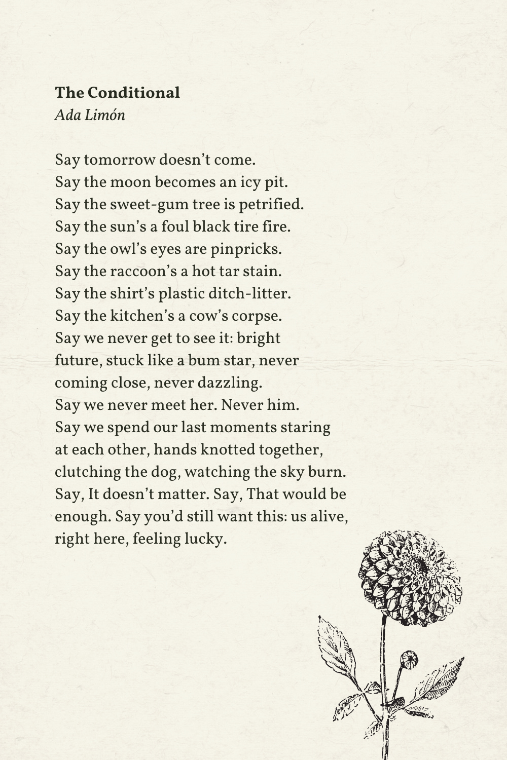Ada Limon is one of my *favorite* poets. It was difficult choosing which poem to include, but I love this one for all of its doomsday imagery. With all the chaos going on in the world, our loved ones are our anchors into happiness. This poem also touches on the quiet longing in romantic relationships to be enough for one another.