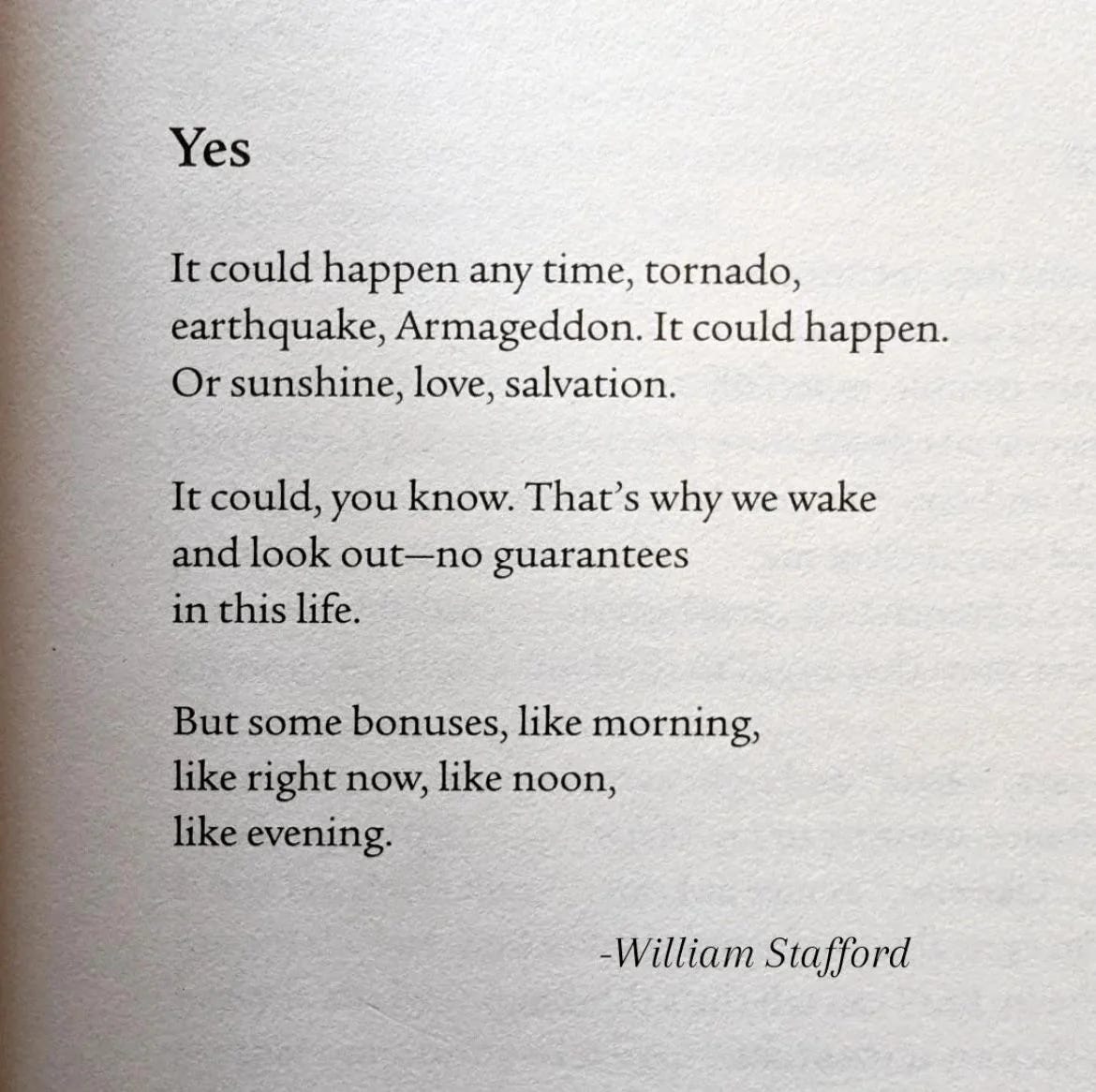 This poem is a reminder that joy and pain are both an inherent part of life. We can’t avoid the Armageddons of the world, but there is so much sunshine to be found within the ordinary days.