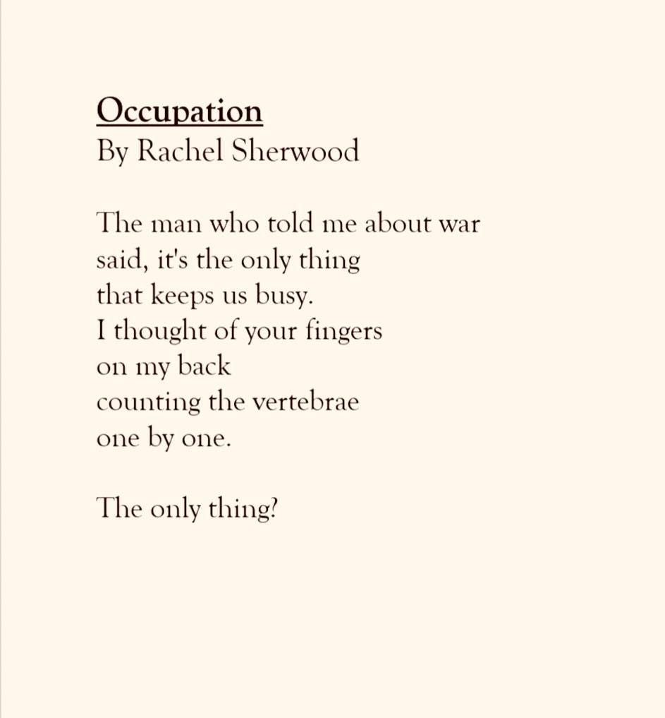 I love the intimacy illustrated in this poem. One of the best parts of being partnered with someone is when the everyday routines start to feel more like magical rituals because you realize how special the other person is to you. When the mundanity of life becomes something to revere. The last line, “I cannot see beyond it.” evokes a sense of blissful isolation, where for those moments, nothing else matters but the interior life of you and your partner.