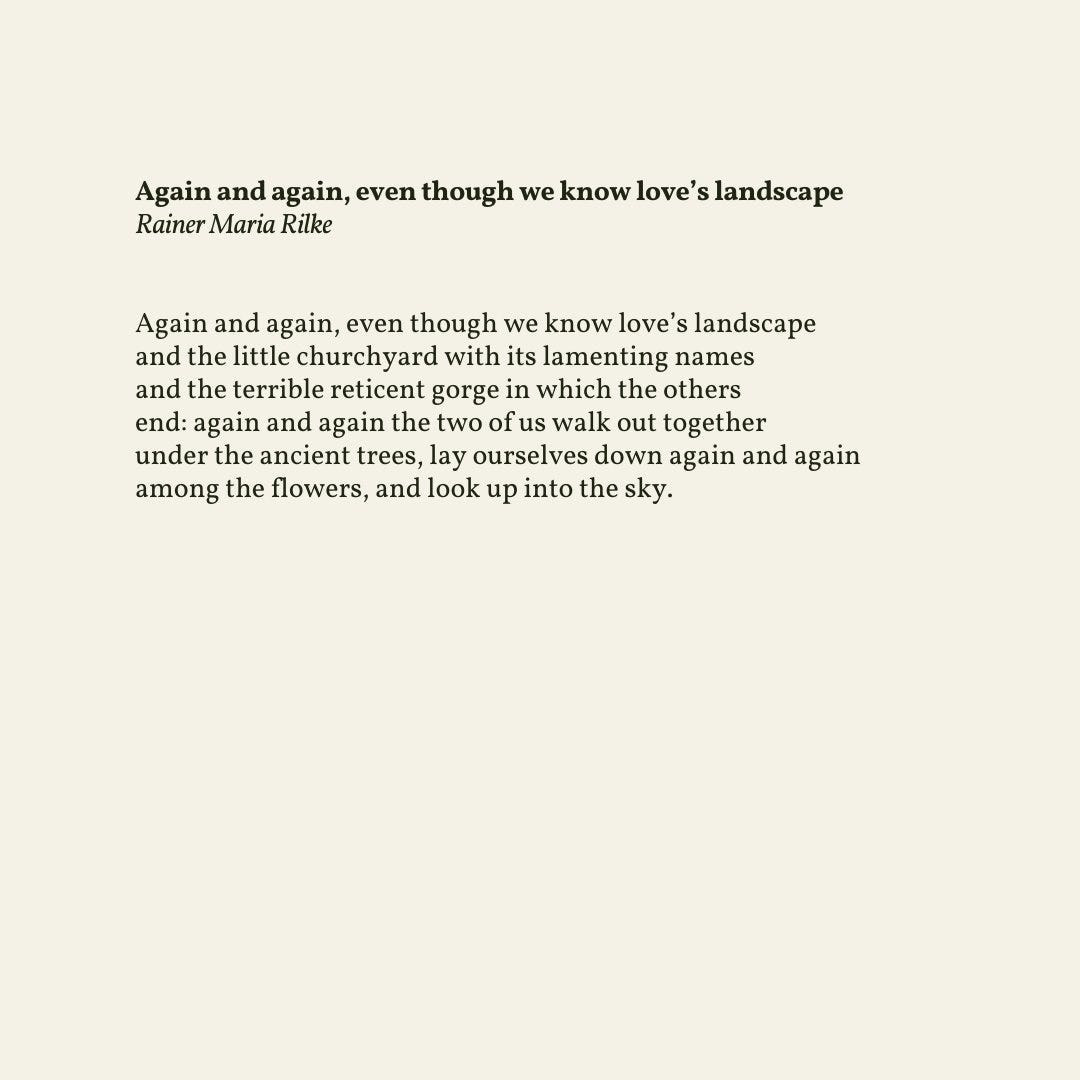 Rilke is a romantic legend in most literary circles. His work often deals with meditations on life, death, beauty, and love. This poem touches on human nature’s devotion to love. The repetition of “again and again” emphasizes this. Despite knowing the brevity of life, the way anything can change in a moment, still— lovers hold tight to a dream.