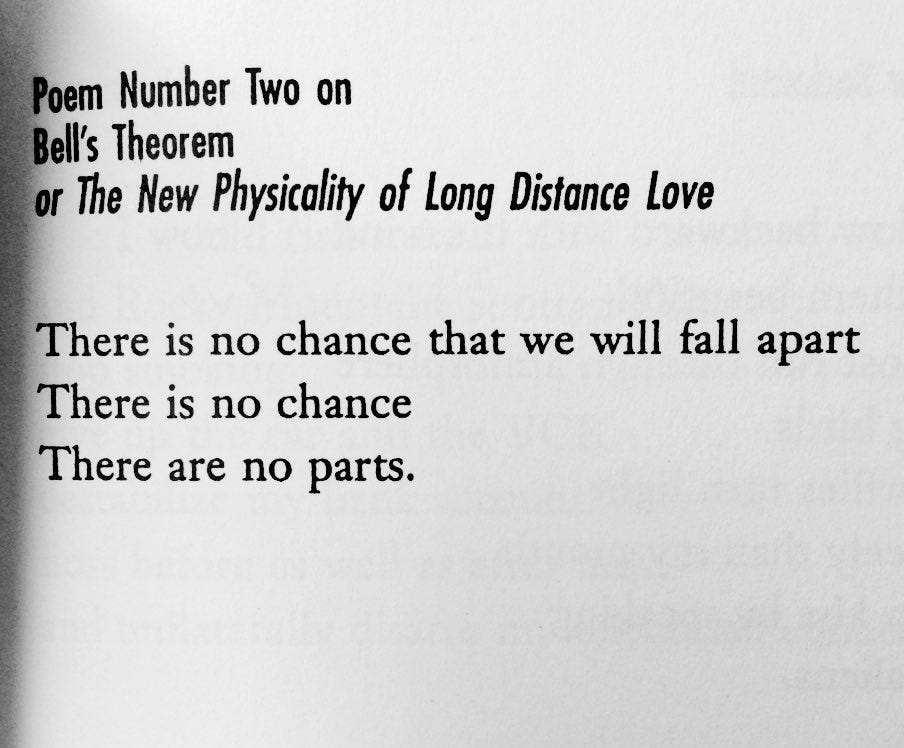 My first reading of this poem felt like a gut punch. I didn’t know whether it was in praise of the possibilities of long distance love, or against it. Truthfully, I’m still unsure. However, I absolutely love this poem for that reason exactly. Its succinctness— the way it distills all the feelings down to a few sentences, touches on something inside of me. In long distance love, or love in general, there sometimes is a fear that things won’t work out. But in this poem, that fear is challenged. How can something intangible, fall apart?